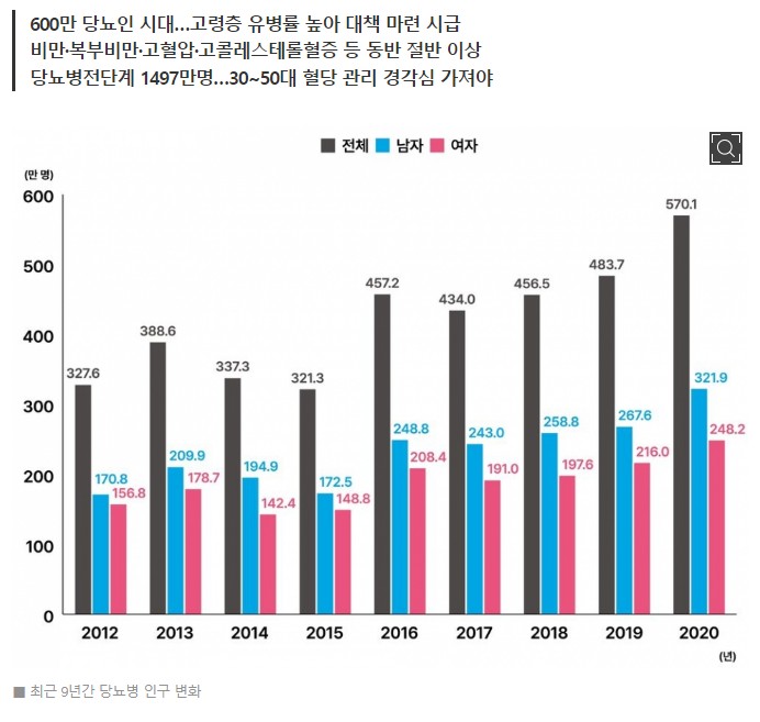 당뇨환자는 600만 명이며, 전 단계는 1600만 명으로 대한 당뇨학회에서는 확인하고 있습니다. 과체중 및 당뇨인구 매년 10%씩 증가하는 추세입니다.