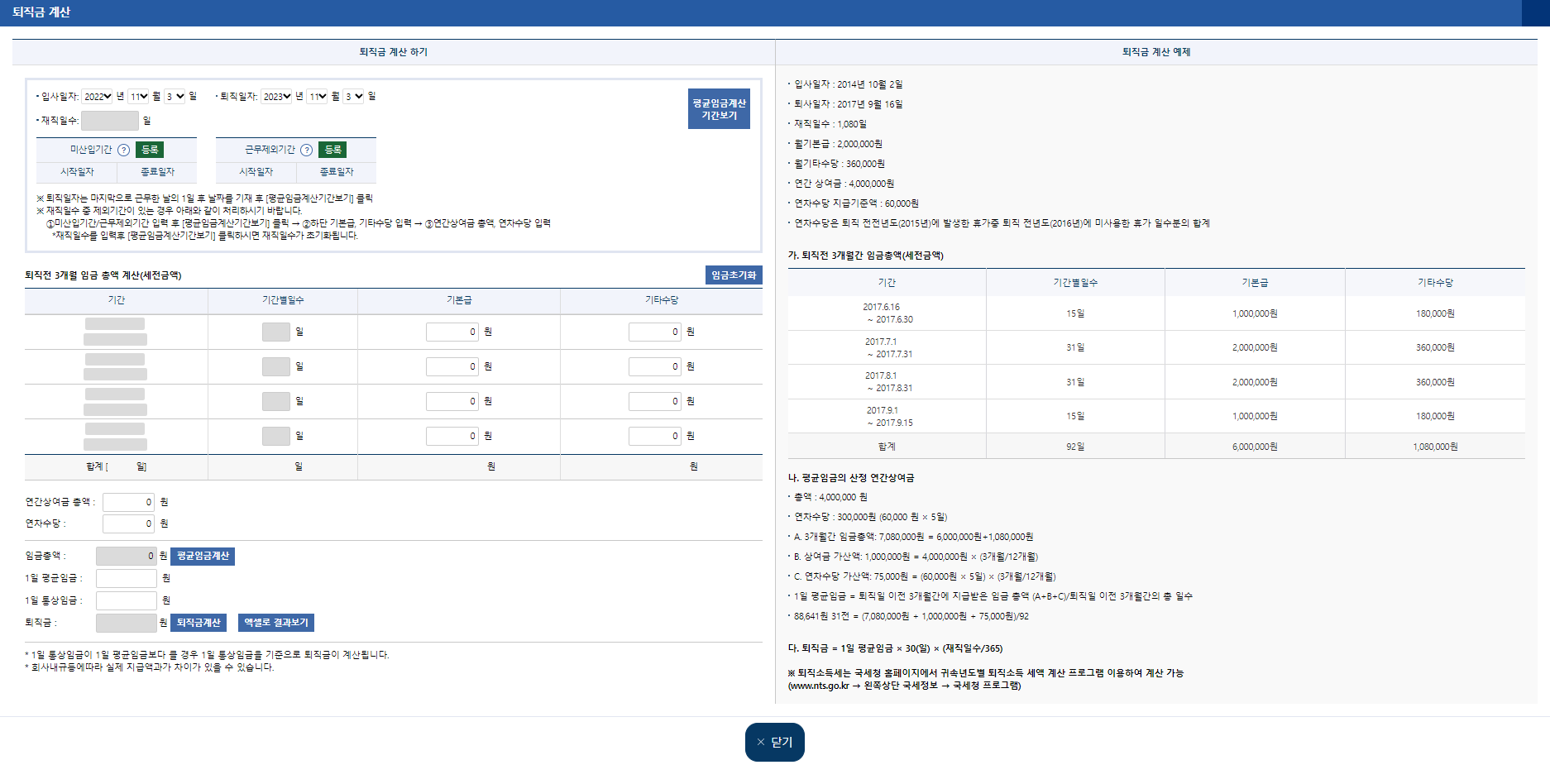 네이버 퇴직금 계산기뿐만 아니라 다음과 고용노동부 홈페이지 등 다양한 곳에서 계산기를 이용할 수 있습니다. 특히, 고용노동부 홈페이지의 퇴직금 계산기는 입사, 퇴직, 재직 일수, 월 기본급, 기타 수당, 연간 상여금 등의 예시를 잘 보여주어 사용이 쉽습니다.