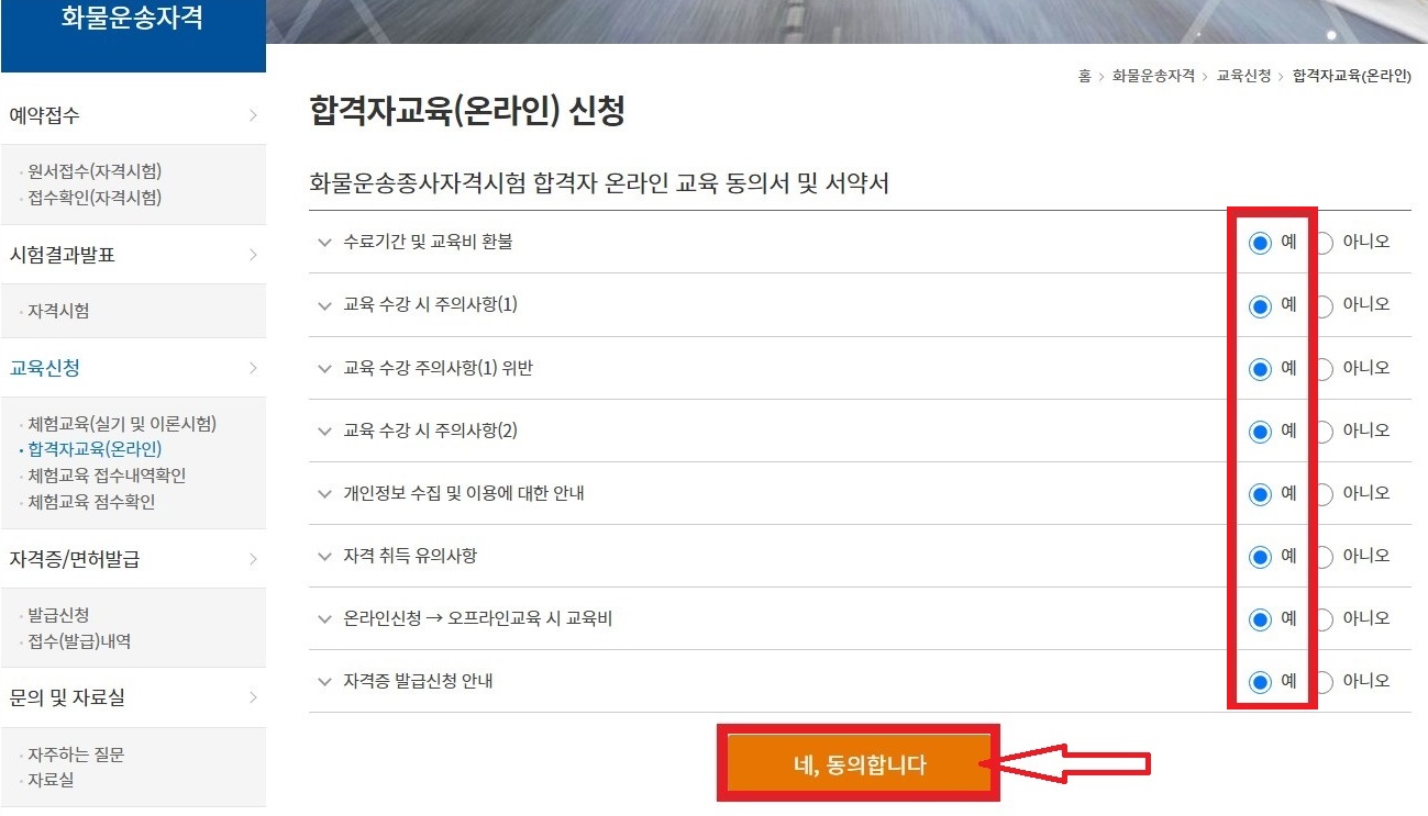 - 합격자 온라인 교육 신청 (신청·조회 > 화물운송 > 교육신청 > 합격자교육(온라인))