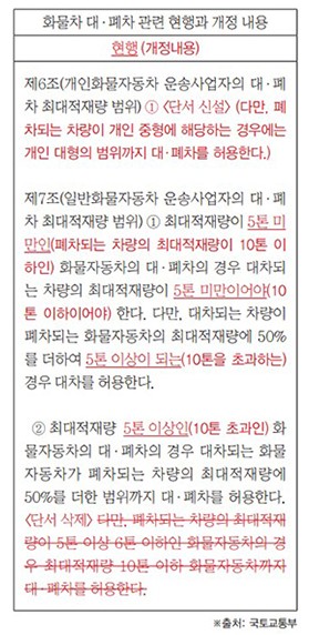 - 화물차 간 유형 변경 대, 폐차를 1년 동안 한시적 허용 (부칙 제2조)