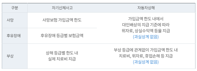 두 가지 보험 모두 자동차 사고로 인해 보험 가입자가 사망하거나 다친 경우에 대한 보상을 제공하는 공통점이 있습니다. 그러나 보상 기준에서 주요한 차이가 있습니다. 가장 큰 차이는 보상금액에 제한이 있는지 여부입니다.