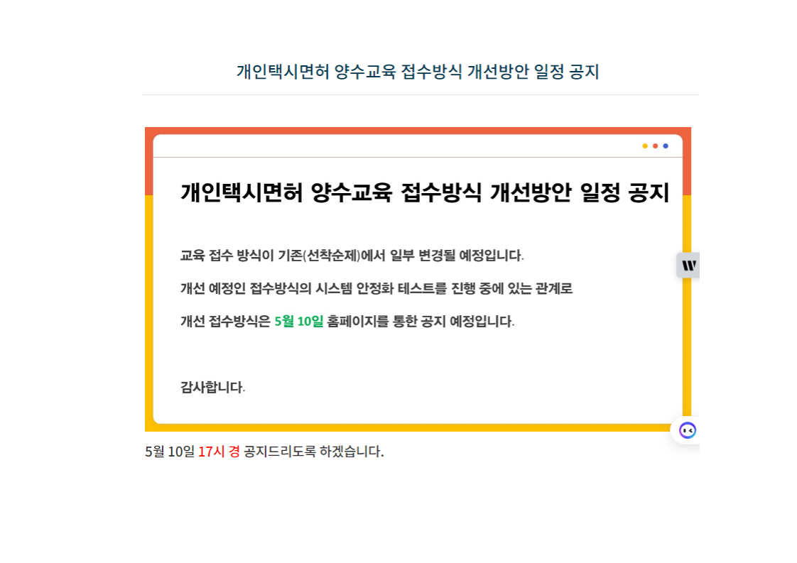 한국교통안전공단에서 시행하는 "개인택시면허 양수교육(일반 및 경력자과정)"의 시스템 및 접수방식에 대한