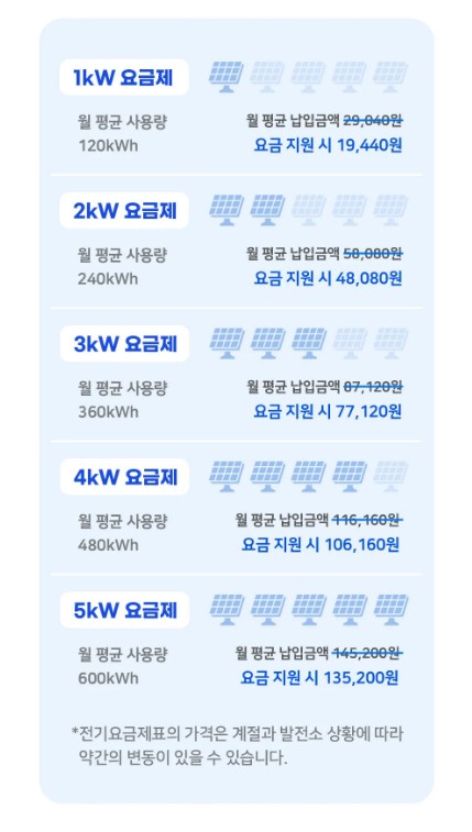 - 원하는 요금제를 선택 가능 합니다. (120 kwh~600 kwh, 1 kwh요금제~5 kwh요금제)