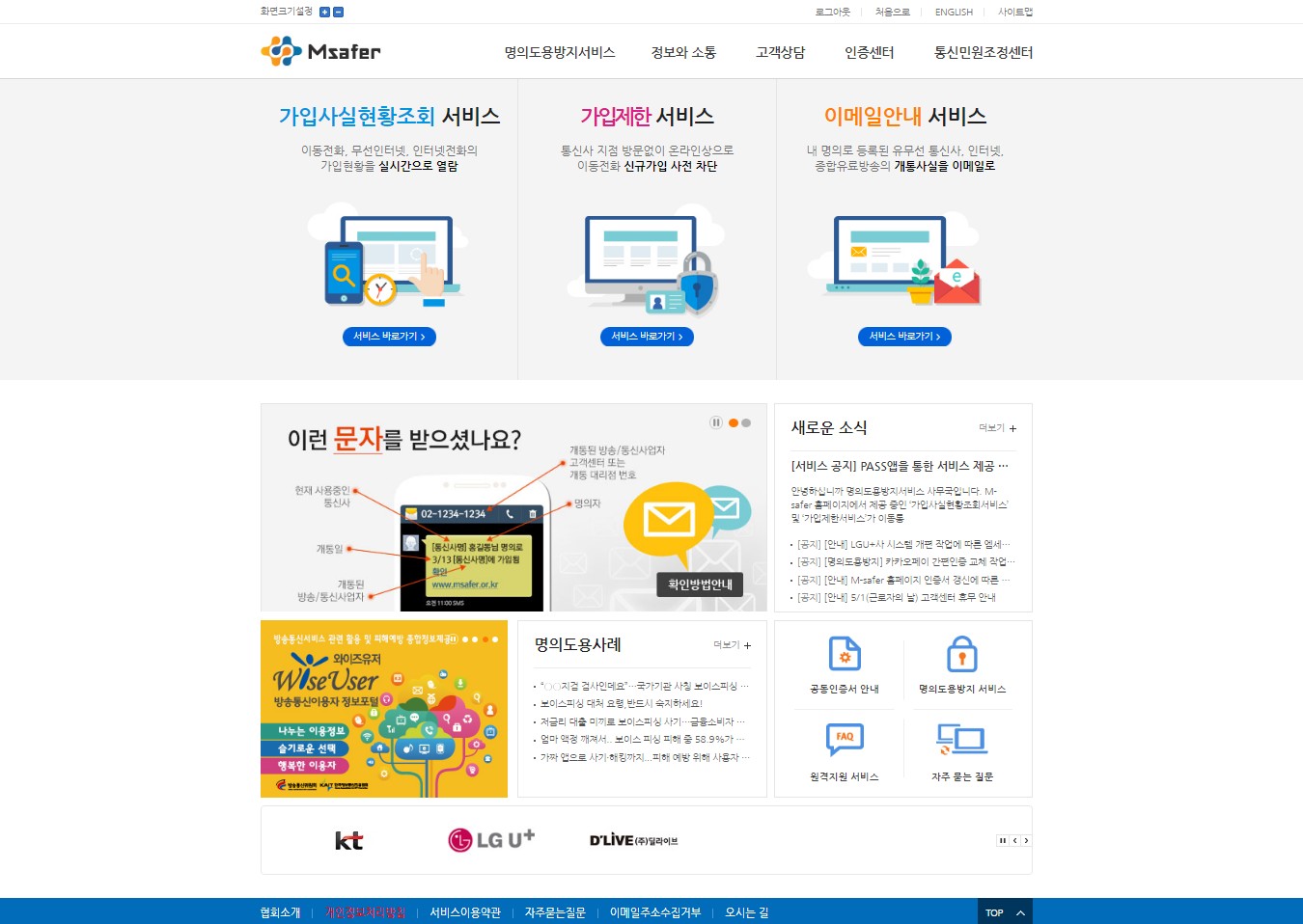 엠세이퍼는 처음으로 여러 통신서비스(휴대폰, 인터넷, 유선전화, 인터넷, 유료방송 등)에 가입했을 경우 가입된 사실을 본인의 명의로 이용하고 있는지 휴대폰 회선을 통해 문자(SMS)로 알려주는 서비스가 Msafer입니다. Msafer 홈페이지[http://www.msafer.or.kr] 가입사실현황조회, 명의도용방지서비스, 가입제한 서비스, 이메일안내 서비스 등 여러 가지 부가 서비스를 제공하고 있으며, 엠세이퍼는 명의도용 피해를 예방하고자 제공하는 무료 서비스입니다.