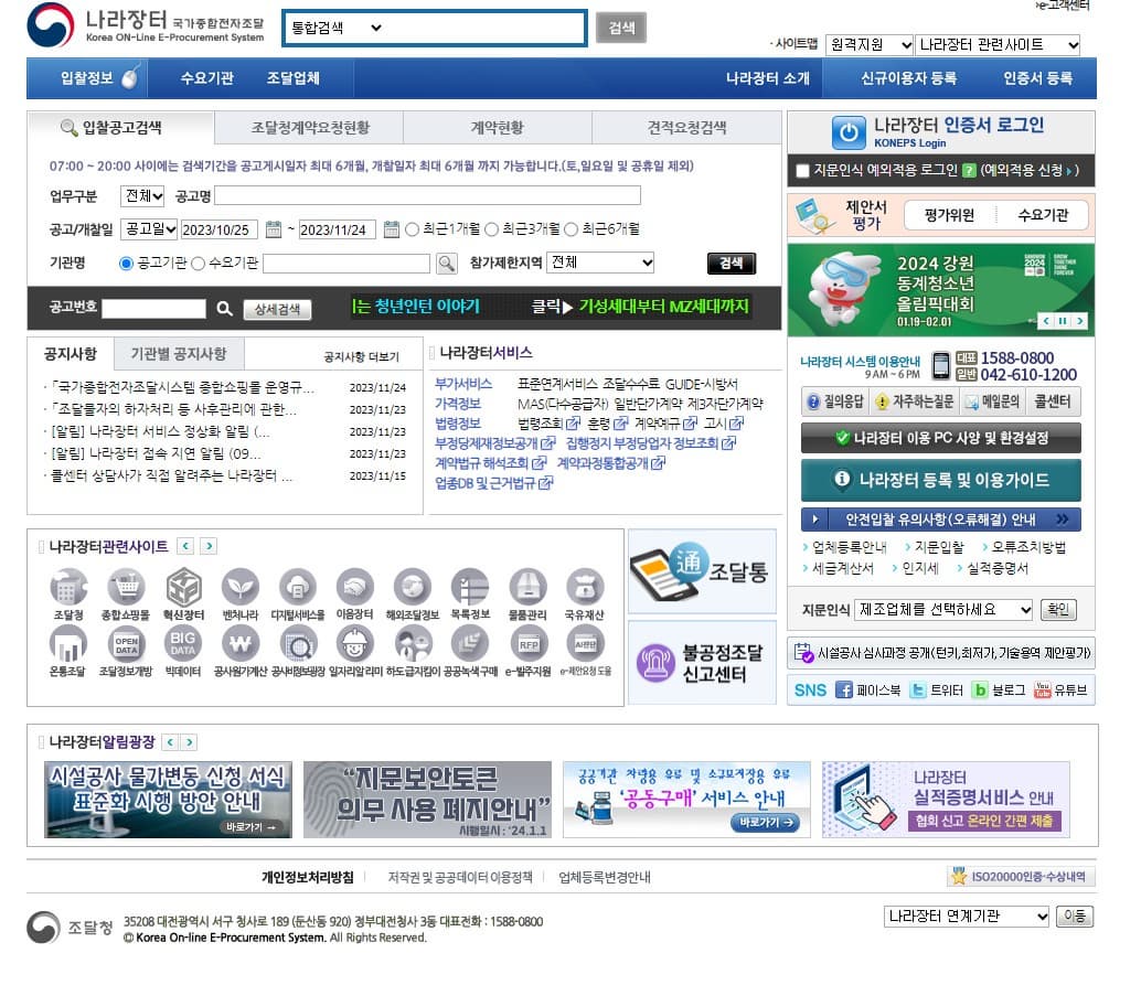 세계 최고 수준의 전자조달서비스 국가종합전자조달시스템(KONEPS)은 공공기관과 민간기업의 시간과 비용을 획기적으로 절감하는 투명하고 깨끗한 대한민국의 전자조달시스템입니다.